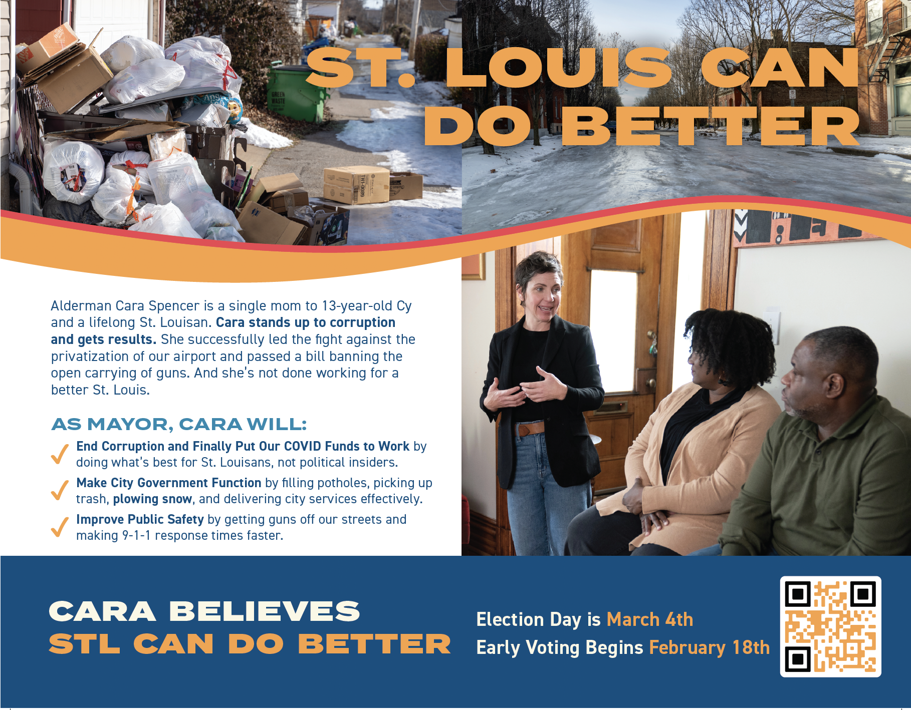 In 2024, Cara Spencer announced her campaign to challenge incumbent Tishaura Jones, who had defeated her by 4% in 2021. Cara’s second mayoral campaign focused on getting the city back to basics—filling potholes, picking up trash, and making neighborhoods safer. This piece was the first in a series that introduced Cara and laid out her vision for St. Louis. Her message resonated with voters and carried her to a 28% victory.